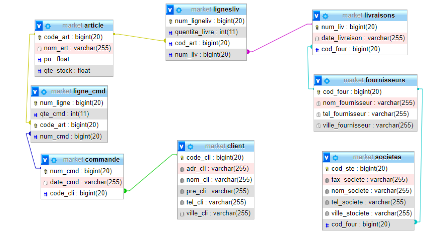 ### Cahier des charges : L’application doit gérer l’approvisionnement de mini-Market, en implémentant les règles de gestion suivantes : • RG1 : Un client peut passer une ou plusieurs commandes. • RG2 : Une commande ne peut être établie que par un et un seul client. • RG3 : Une commande contient plusieurs lignes de commandes avec des articles différents. • RG4 : Une livraison peut contenir plusieurs lignes de livraison de même article. • RG5 : Un article peut être livré par une ou plusieurs sociétés de distribution. • RG6 : Une société de distribution a un seul fournisseur. • RG7 : Un fournisseur peut livrer les articles pour plusieurs sociétés de distribution. • RG8 : La quantité en stock est une information qu’on peut calculer à partir de la quantité livrée et la quantité commandée.