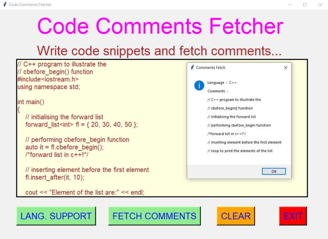 - After entering the code snippets, user will be able to fetch all the comments present in that code snippets.