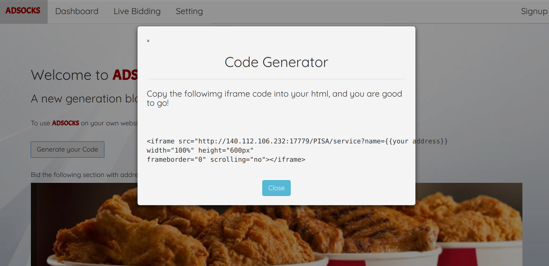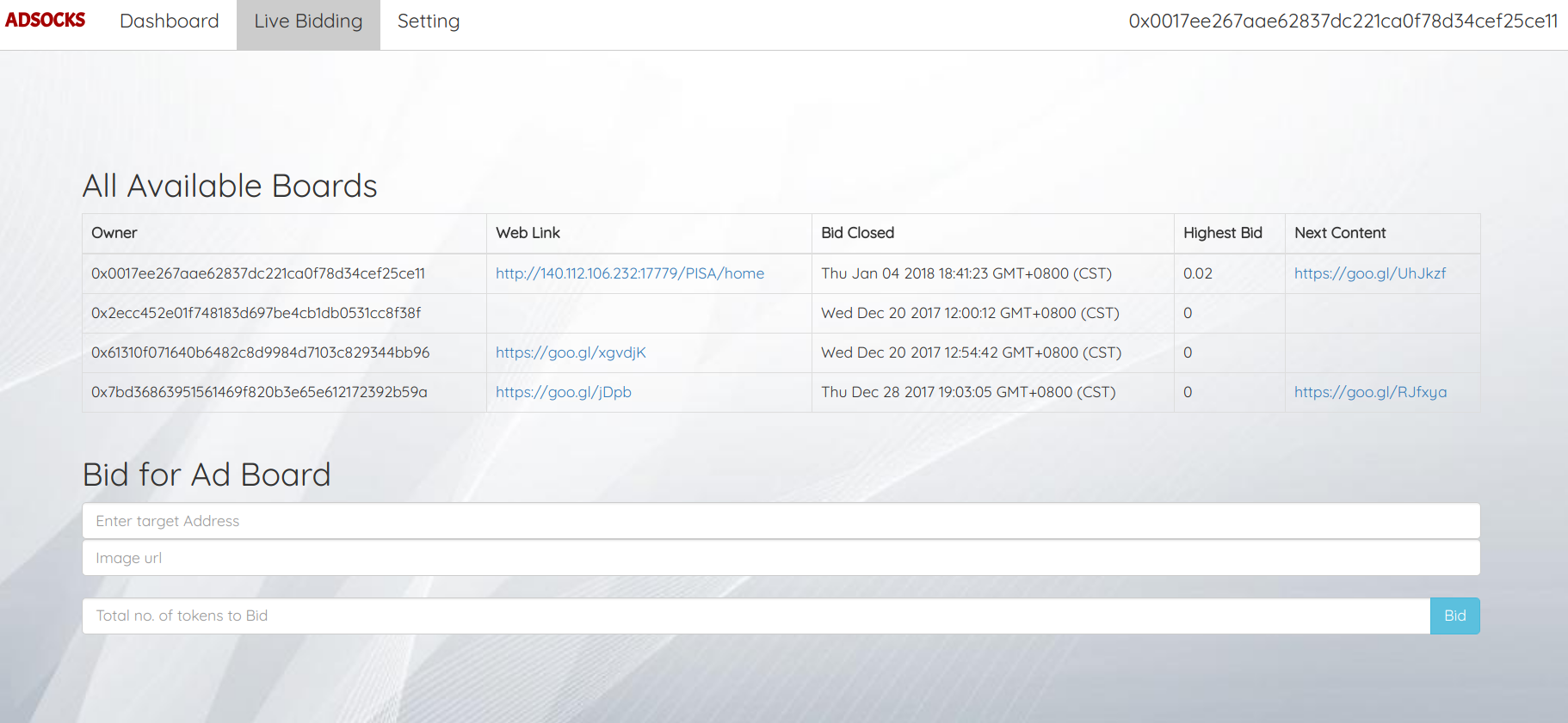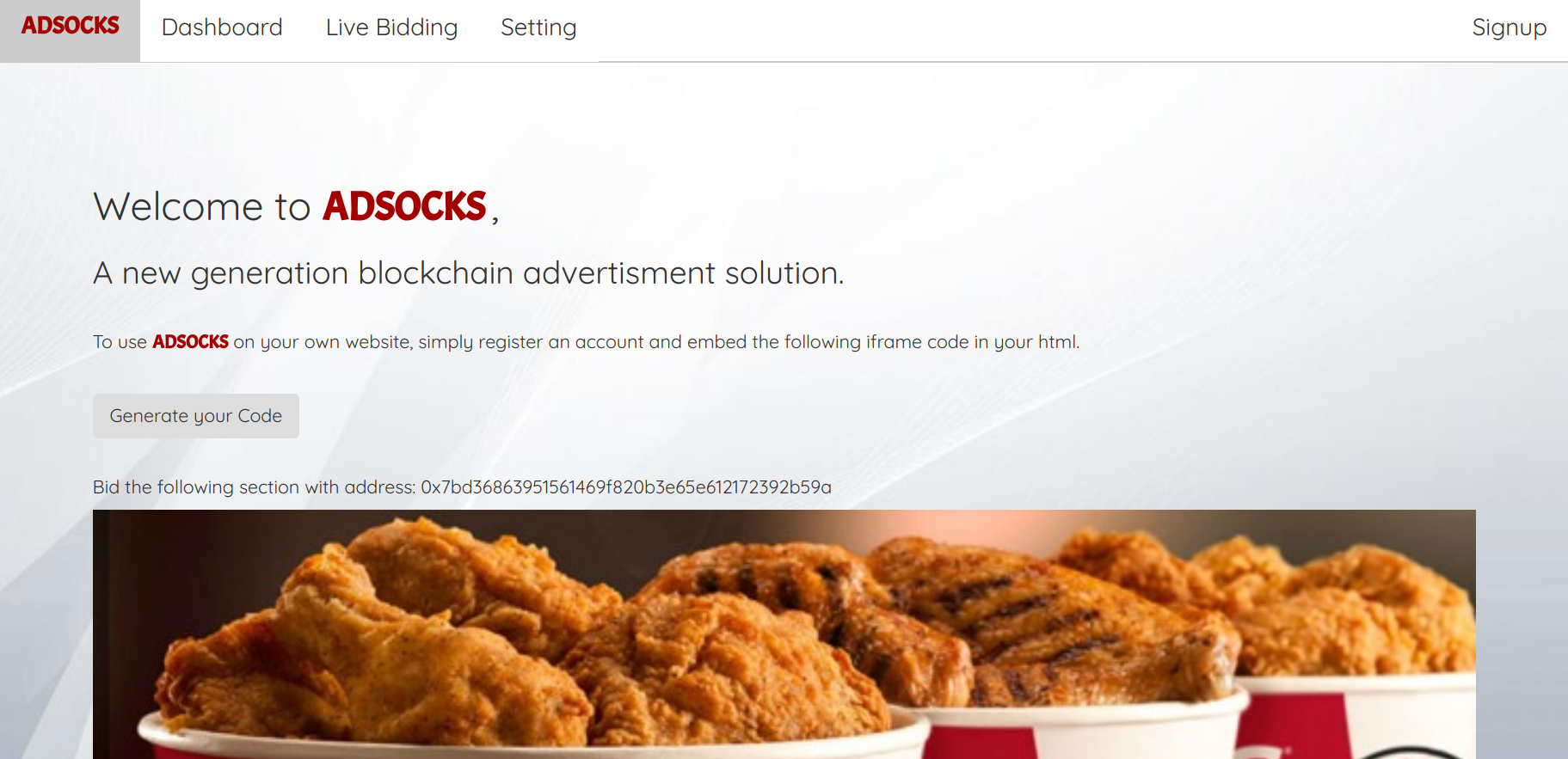 This is a platform for ad exchange. Bloggers can easily sign up our platform (with metamask), and by embedding an easy code within the html, the ad board will become available for all the other users to bid on our platform. The user who offered the highest bid within the bidding period can control the ad content in the next bidding period.