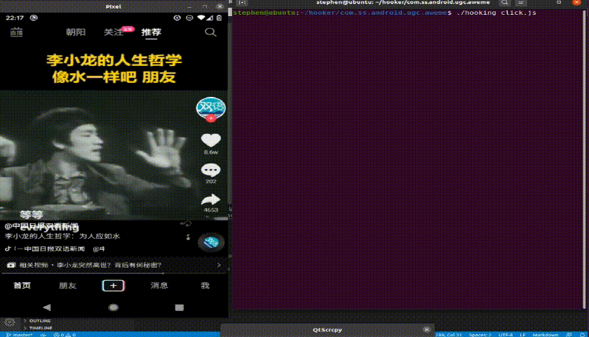 -rwxrwxr-x 1 stephen stephen 5552 3月 16 20:55 xinitdeployhooking命令需要在后面跟一个脚本文件名作为参数,例如 ./hooking url.js。hooking实际上是在传统frida attach的基础上增加了将hook输出信息持久化到log文件中,比如当你hook一个调用非常频繁的函数比如某些字符串生成,输出的日志量无法短时间去全面,这时候你可以用文本编辑器打开log文件慢慢分析。以抖音工作目录为例,hooking实现如下