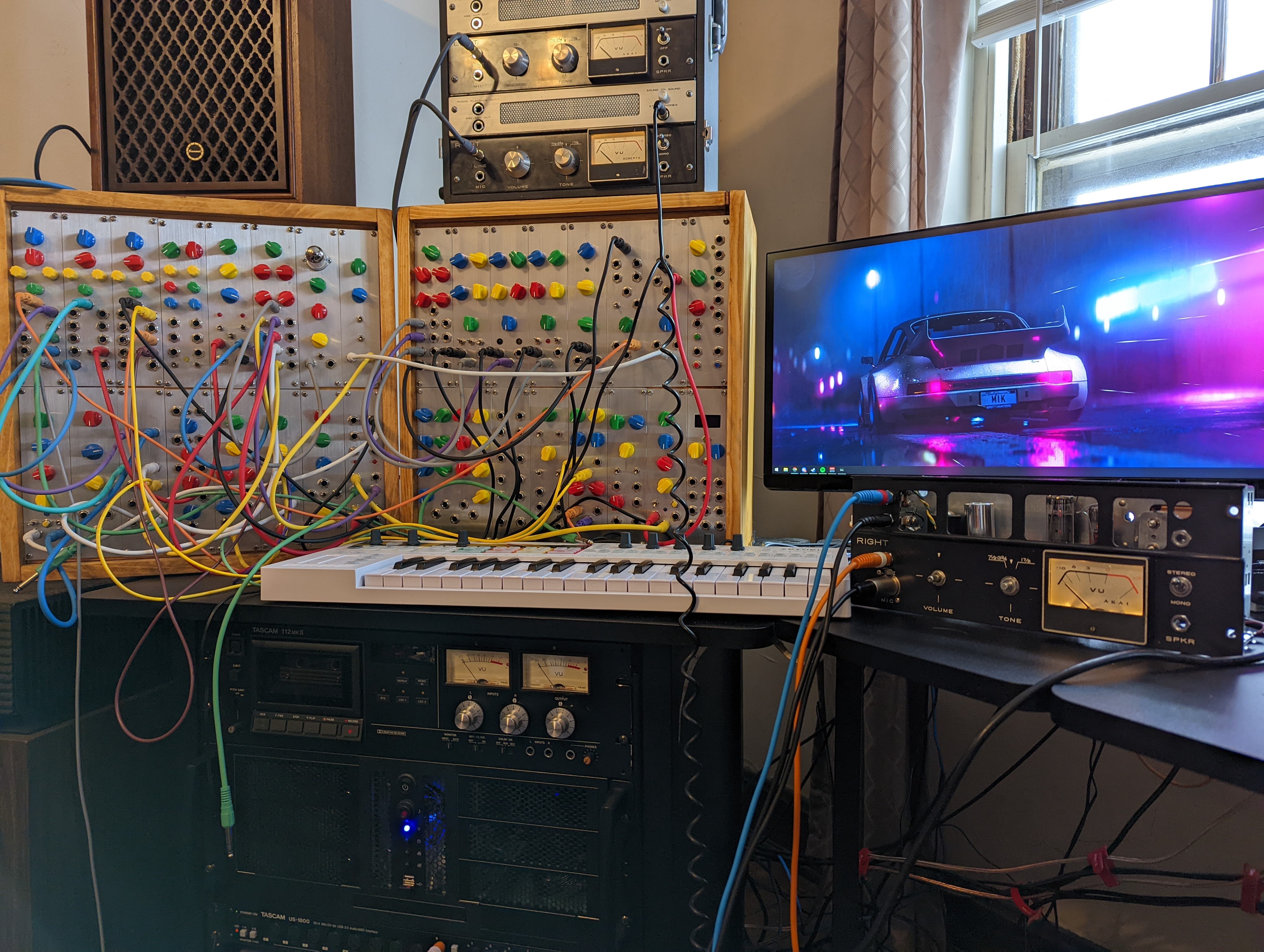 Here is a picture of two full cabinets, featuring my keystep pro sequencer, tape machine/headphone tube amp, and a mic/guitar pre amp I just finished up.