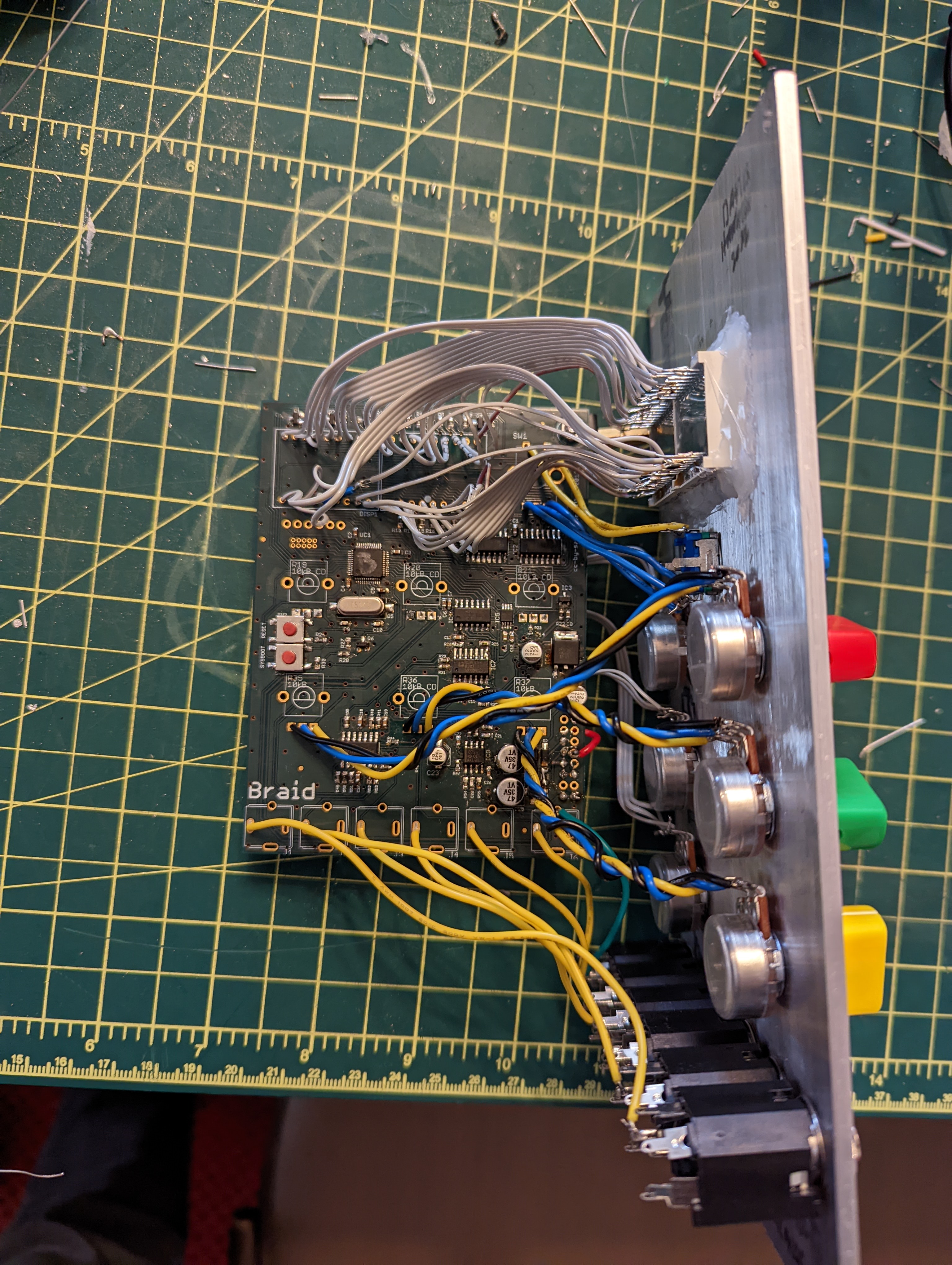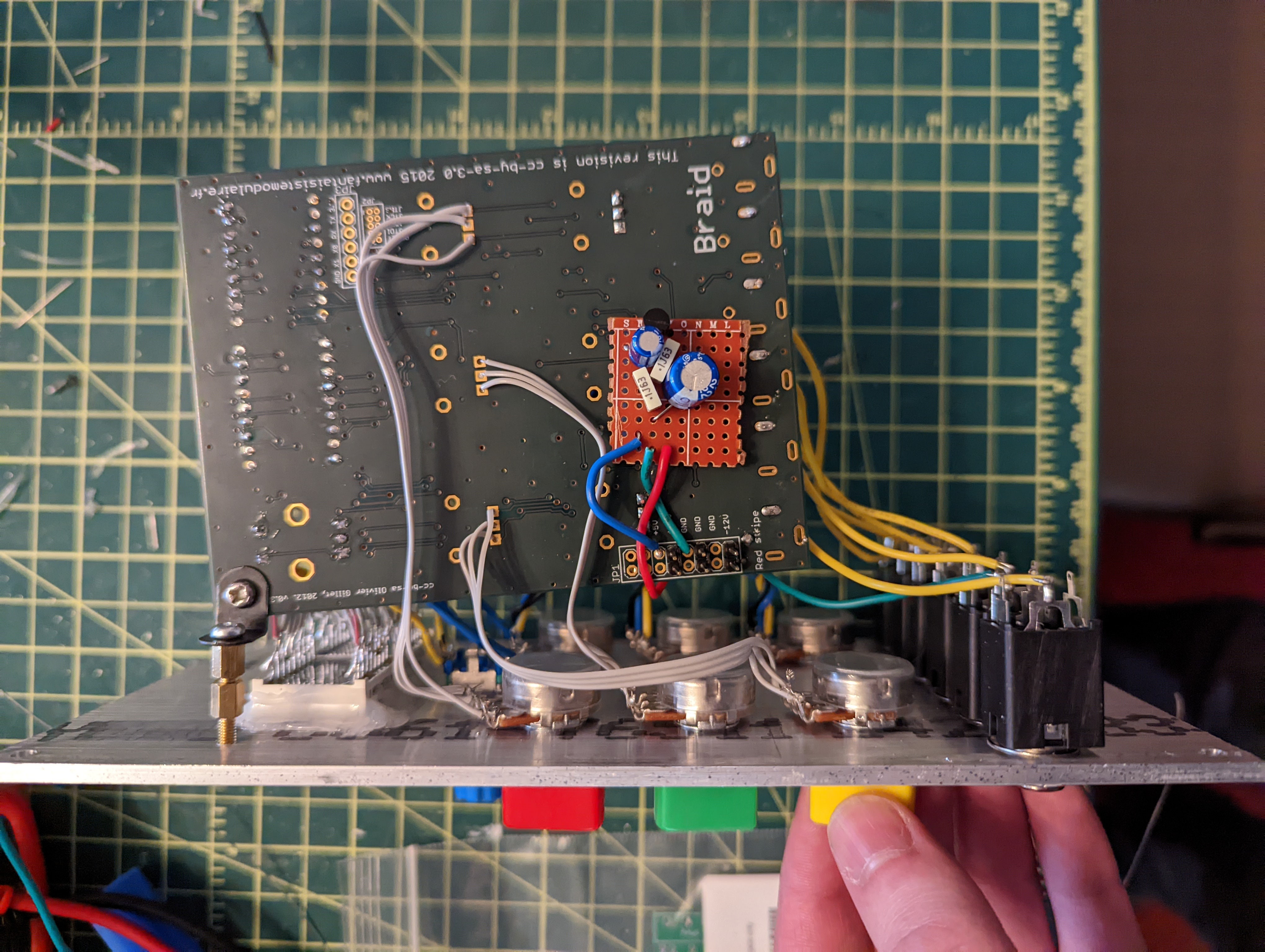 For some reason I thought it would be great if I could start adapting euro modules into my system. Doing so has been quite an adventure in learning how to solder SMD components and learning how to flash a program onto a microcontroller, and to be honest it hasn't been so bad. I actually learned to enjoy it quite a bit! The first one I made was the Ornament and crime which went together pretty smoothly and even started working right away! It can be seen at the very bottom right of the system shot. Next I went for a Mutable Instruments Braids. This one wasn't quite as easy as the OC, but I got it working in the end! The main issue I encountered was that I didn't realize that since the PCB that I ordered ended up being for an older version of the module, I had to provide my own +5 volt source to the module along with the +/- 12v that most modules normally require. I ended up throwing together a small 5v regulator using a 7805 and a few capacitors on a piece of stripboard which I hot-glued to the back of board.