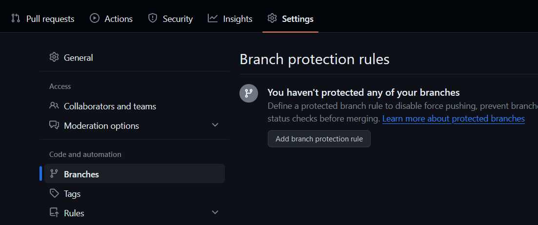 the Code and automation section. Press Add branch protection rule button.
