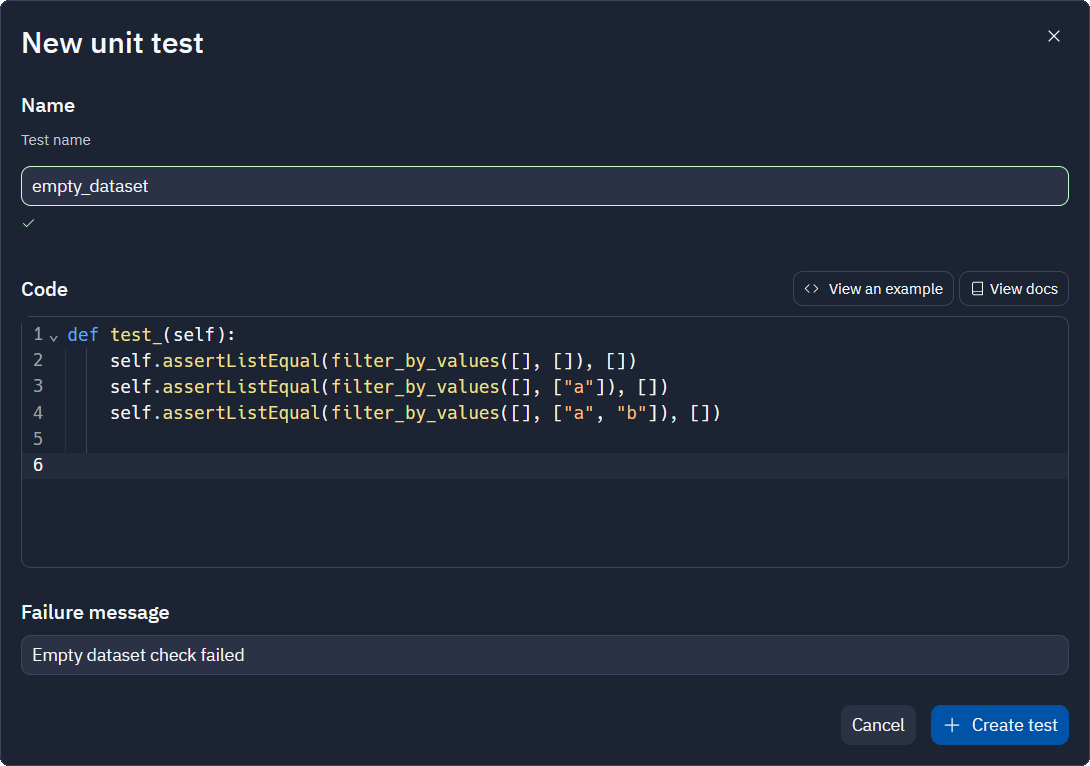 pressing Add test button. Provide a test name (omit "test" at the beginning),