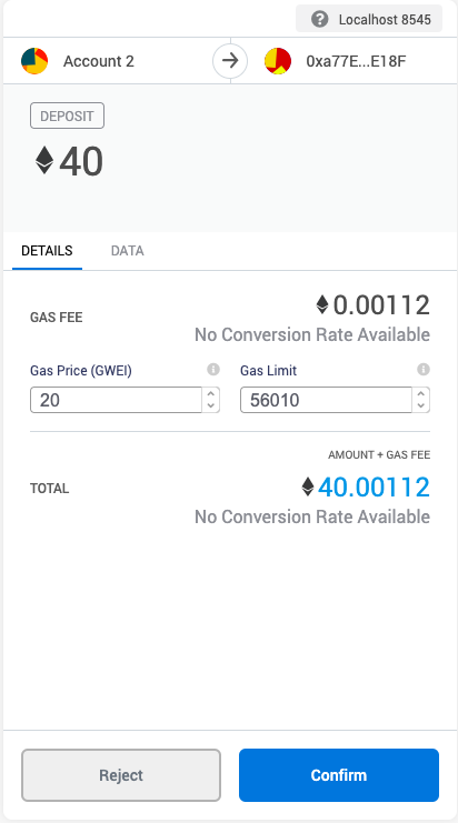 Deposit of 40 Ether is executed through MetaMask: