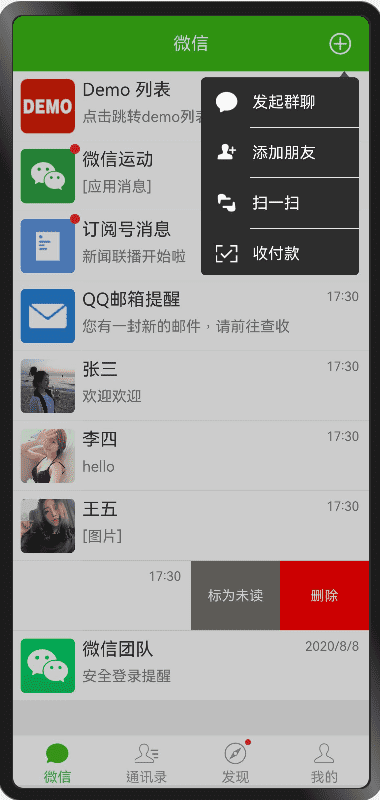 • 仿微信UI(首页,通讯录,发现和个人中心等)