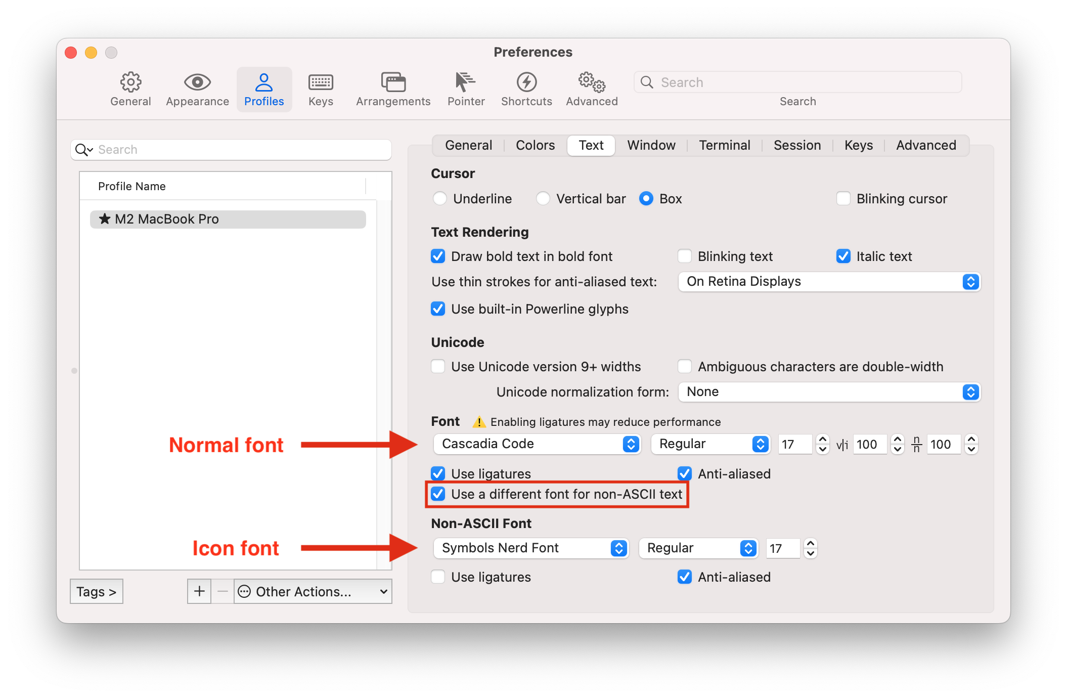 Leveraging this approach depends on your terminal. In iTerm2, for example, you need to check “Use a different font for non-ASCII text” in the Preferences panel. Then select Symbols Nerd Font Mono font under “Non-ASCII font”. (see screenshot below)