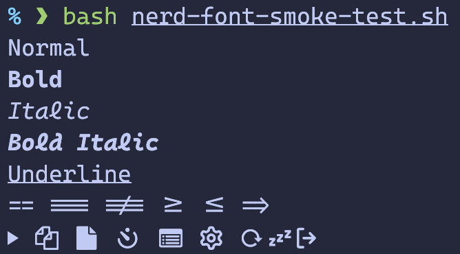 If you want to check whether icons and ligatures are working properly, try running the included nerd-font-smoke-test.sh script from the root of the dotfiles folder like so: