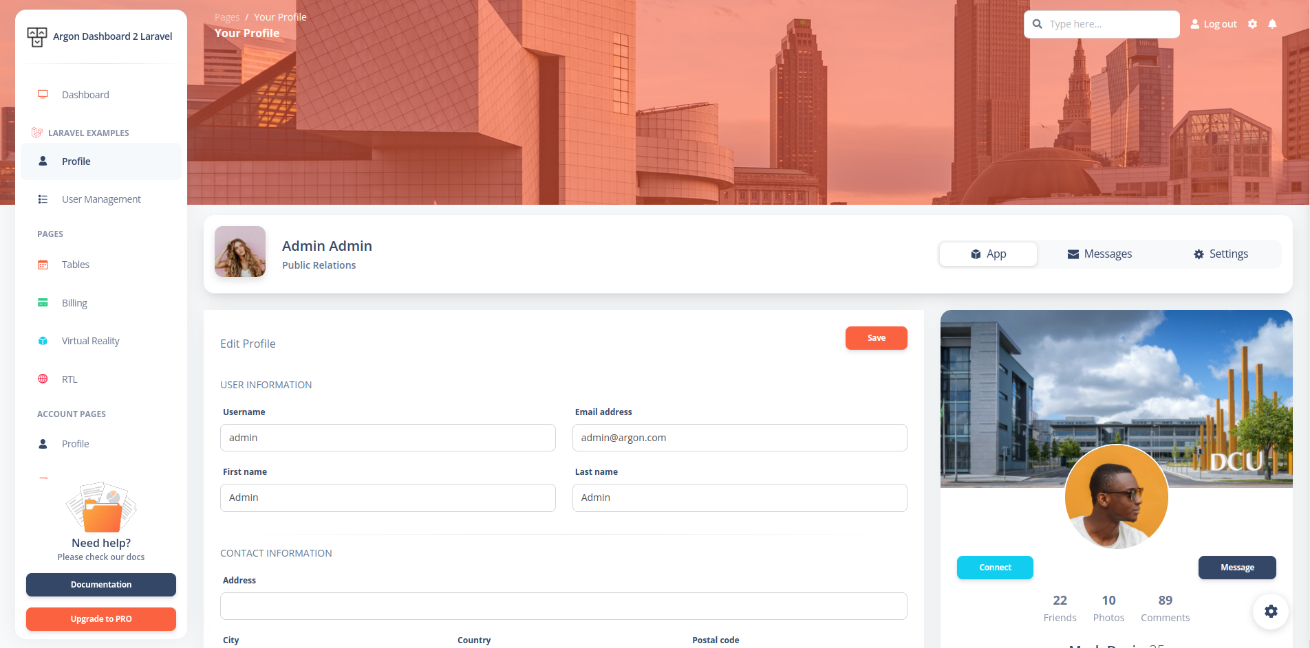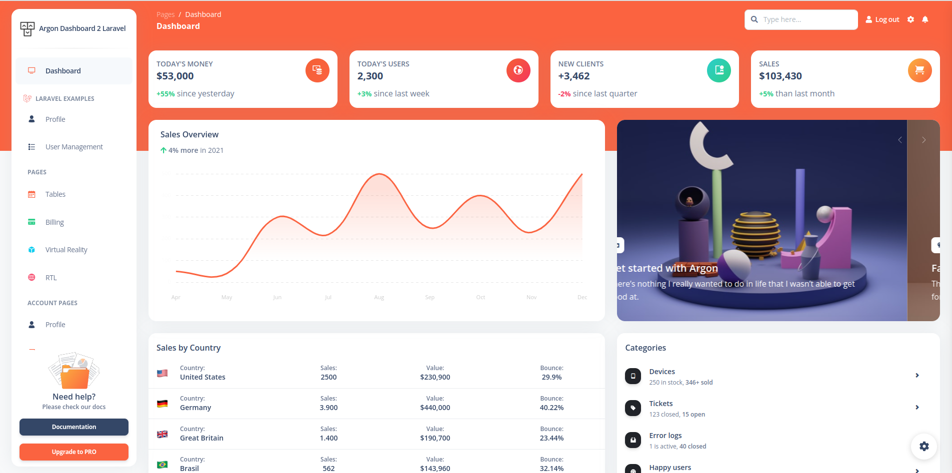 If you want to get more features, go PRO with Argon Dashboard 2 PRO Laravel.