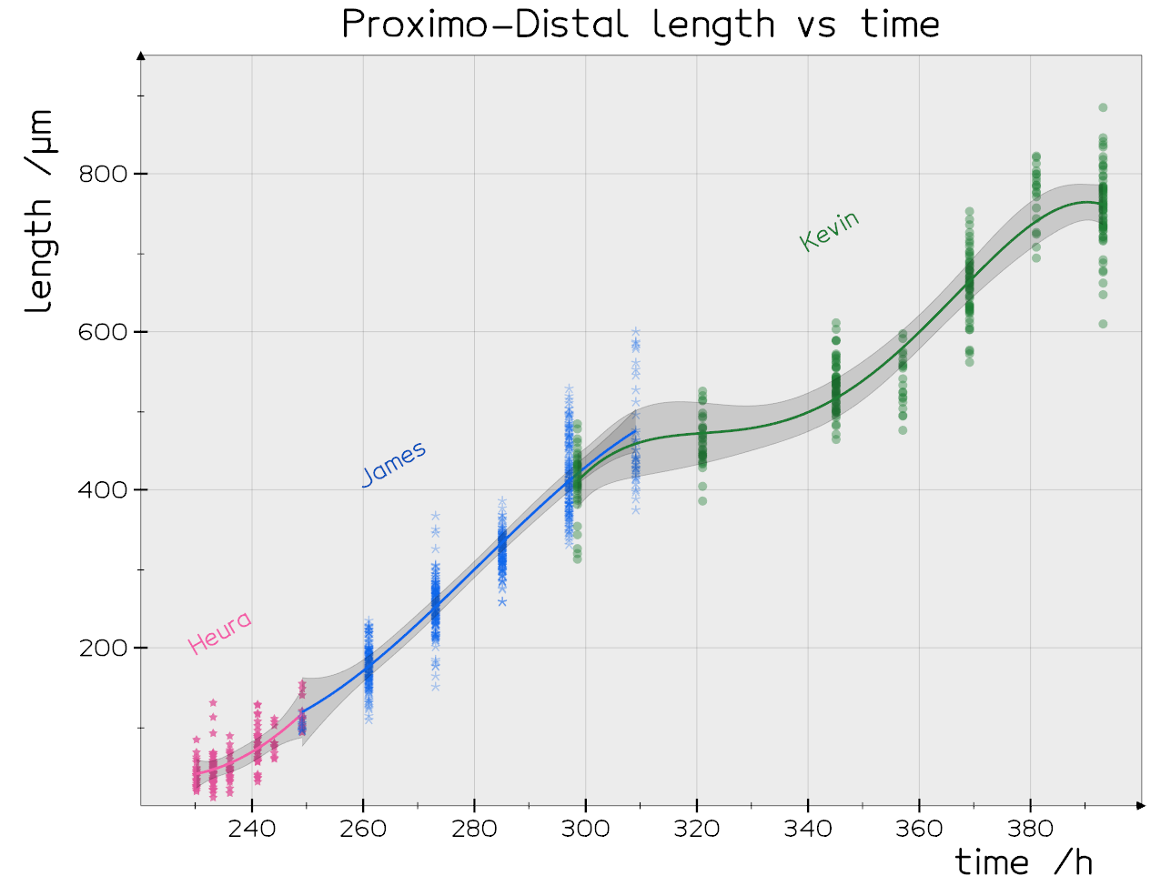 python compareSizes.pyplots the resulting growth of the limb for the 3 datasets as a function of time:
