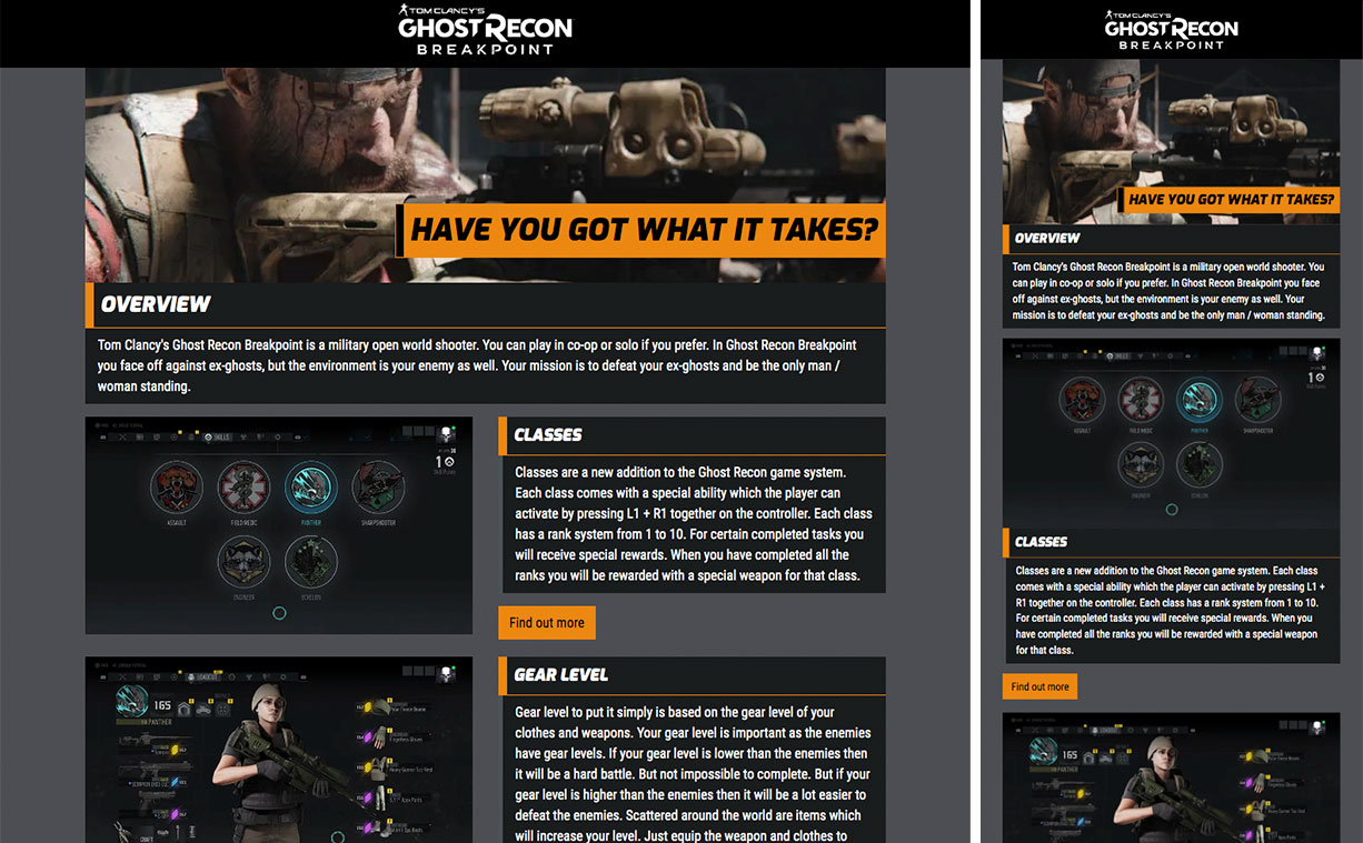 The Ghost Recon breakpoint landing page is a static generated accessable and responsive site using the Next js framework. And uses SASS with a BEM approach for the styling of this page. All of the data used in this prototype is consumed from an external JSON file.