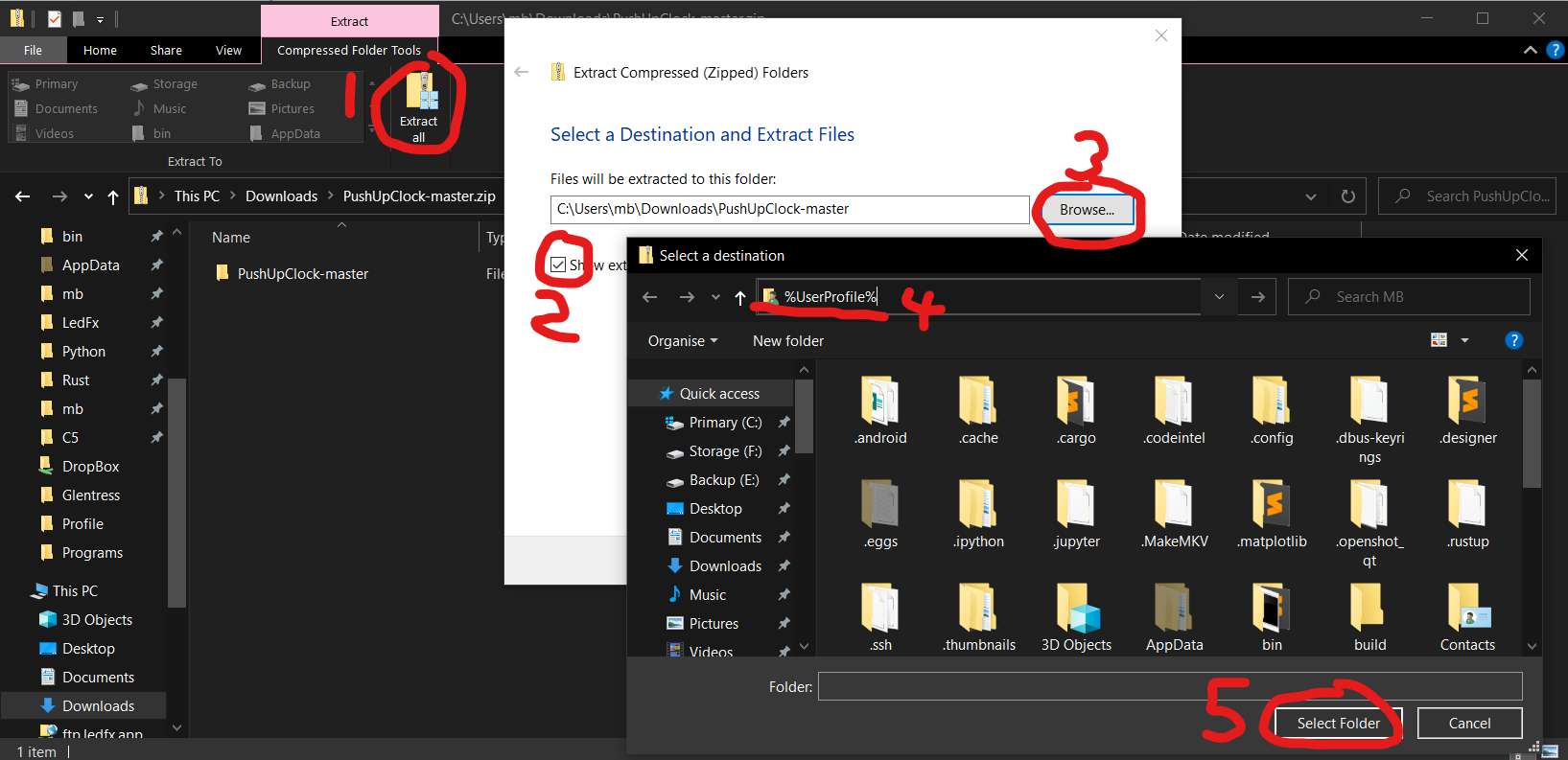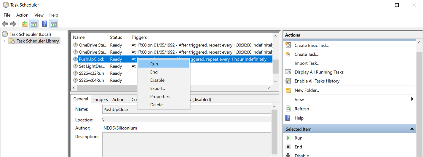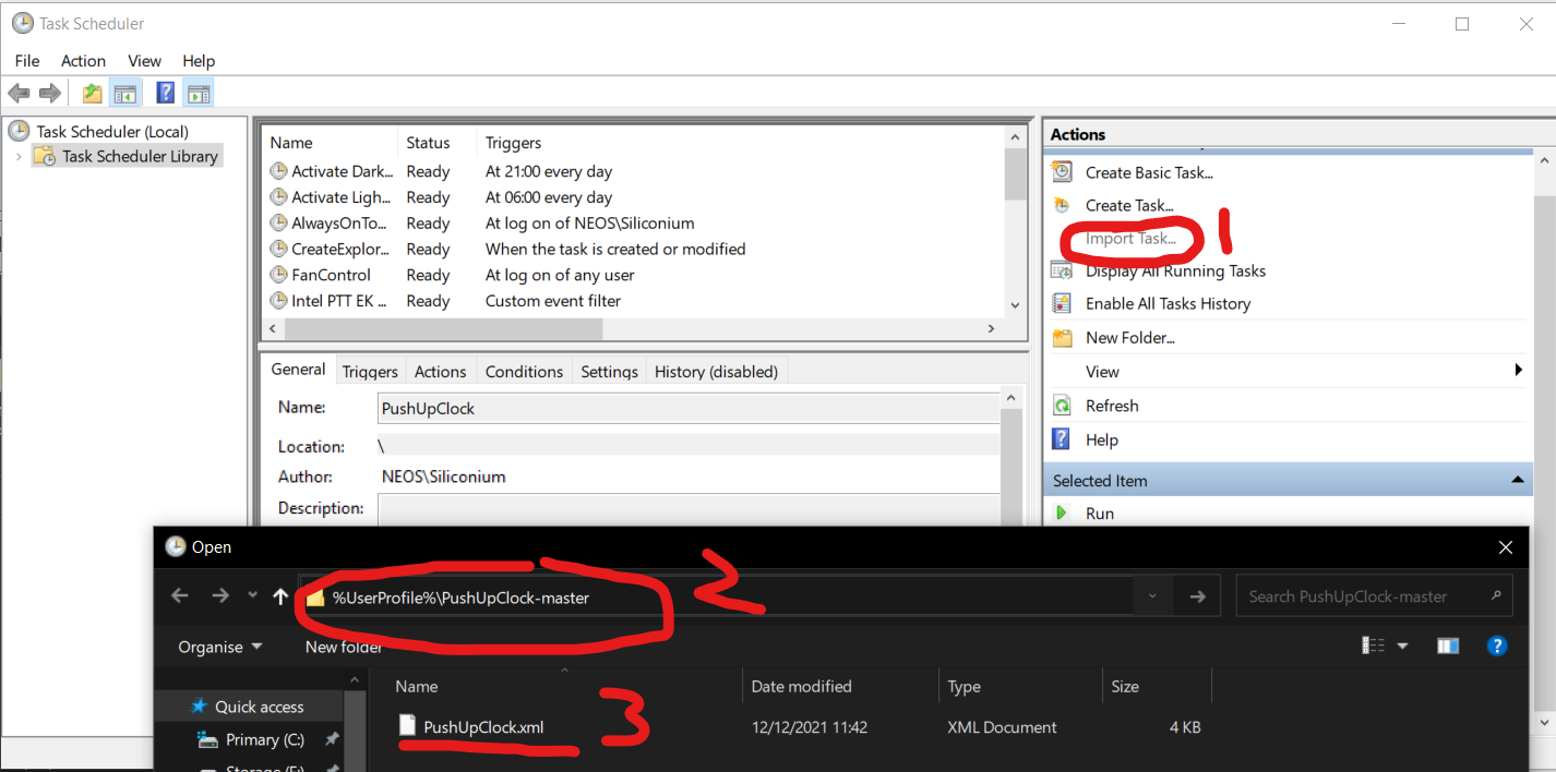 Start -> "Task Scheduler", and clickImport Task. In the bar, go to%UserProfile%\PushUpClock-masterand choosePushUpClock.xml. Feel free to make changes to the task. It's set to run every hour once you've logged on.
