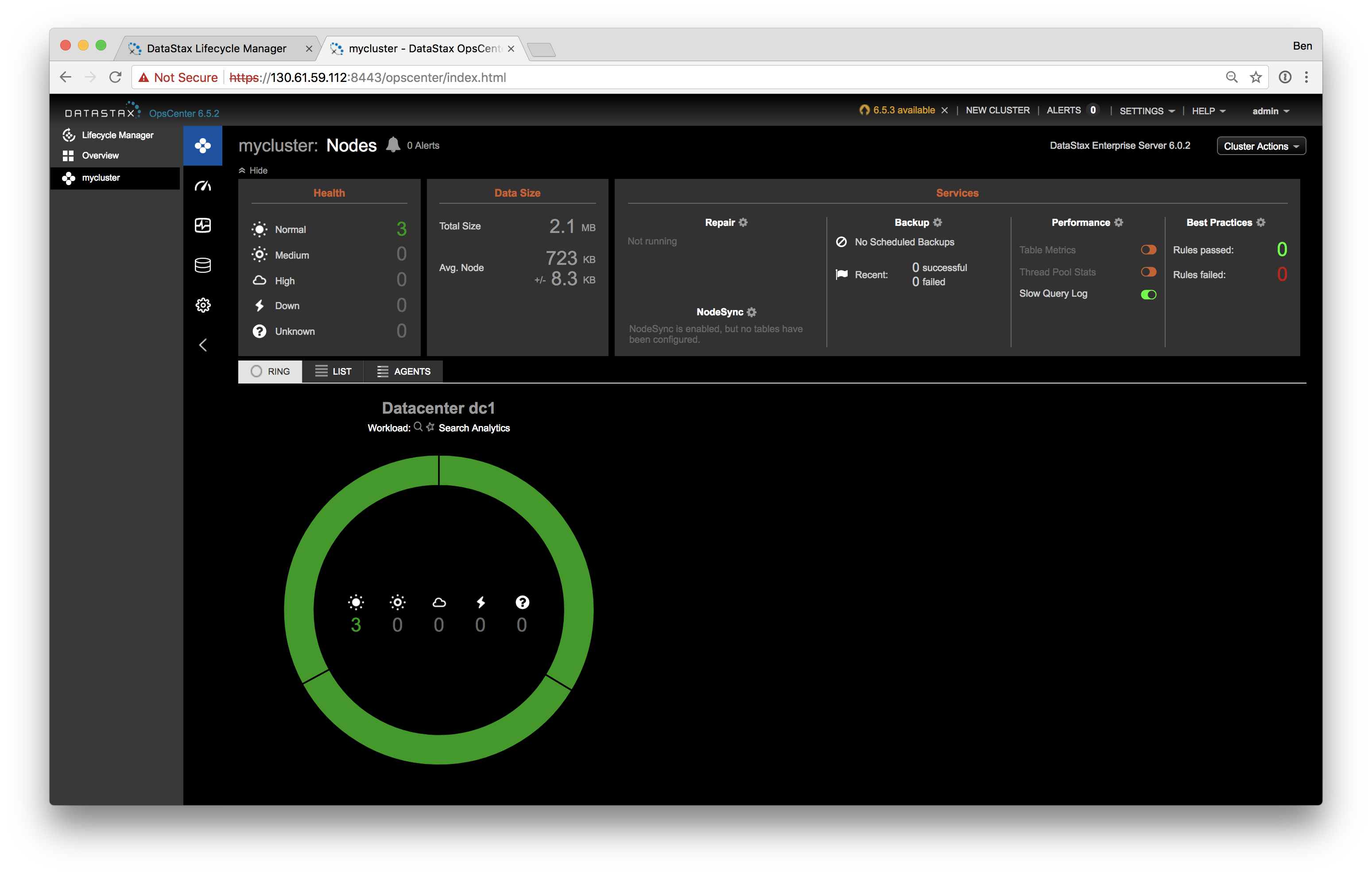 In this case, the job isn't done yet. If we drill down on clusters we can see that the nodes have been added but LCM hasn't yet SSH'd into them to install DSE.