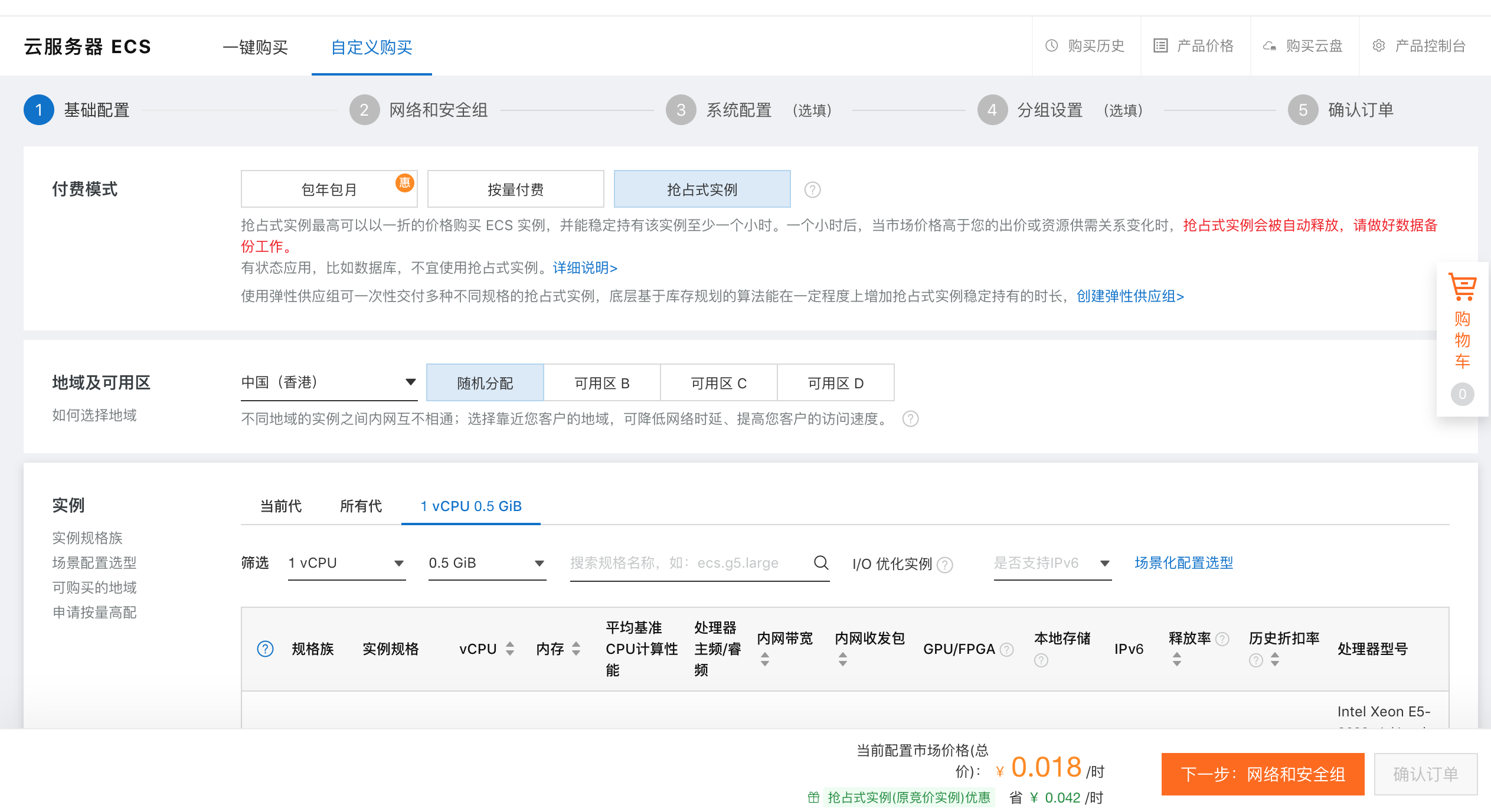 默认创建的是香港地区的抢占式实例,内存 500MB, 1 CPU, 系统盘 20GB, 按流量计费(1元/G), 公网出口带宽 10Mbps, 1 小时候自动释放。