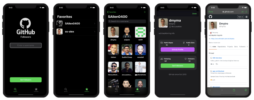 Search for any Github user, and view their profile, followers, and save them to your favorites for quick access later.