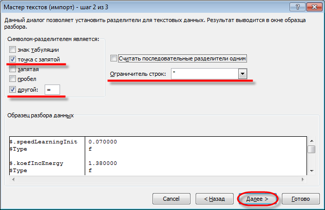 В качестве символа-разделителя выбираем точку с запятой (;) и знак равно (=), указываем ограничитель строк.