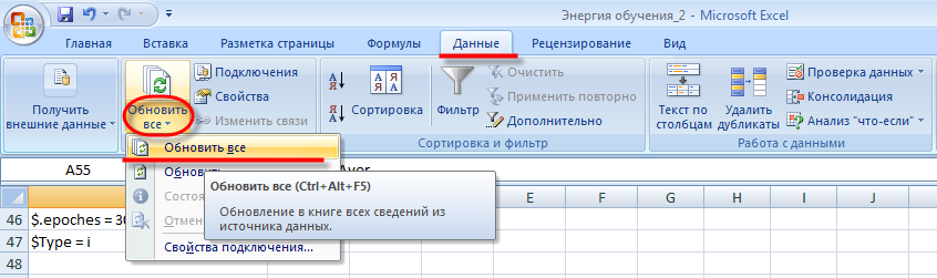 Для импорта данных в файл и, соответственно, обновления графиков, нажимаем: меню Данные – Обновить – Обновить все. В появившемся окне выбираем соответствующий файл с обучающими данными.