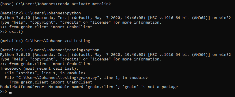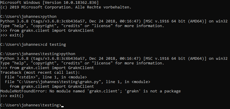 Traceback (most recent call last): File "c:/Users/Johannes/testing/grakn.py", line 1, in <module> from grakn.client import GraknClient File "c:\Users\Johannes\testing\grakn.py", line 1, in <module> from grakn.client import GraknClient ModuleNotFoundError: No module named 'grakn.client'; 'grakn' is not a package